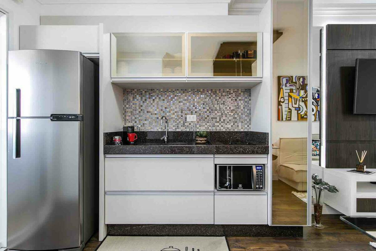 Esse estúdio fica em um condomínio de alto padrão, com academia, piscina coberta e sauna. Todas as comodidades colocadas à disposição do hóspede. É uma opção compacta, mas muito confortável com todos os ambientes integrados.