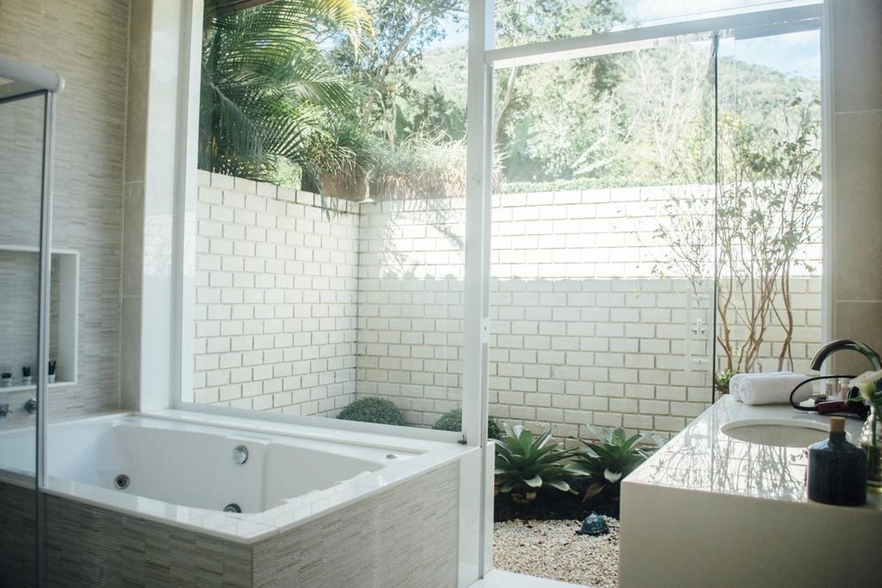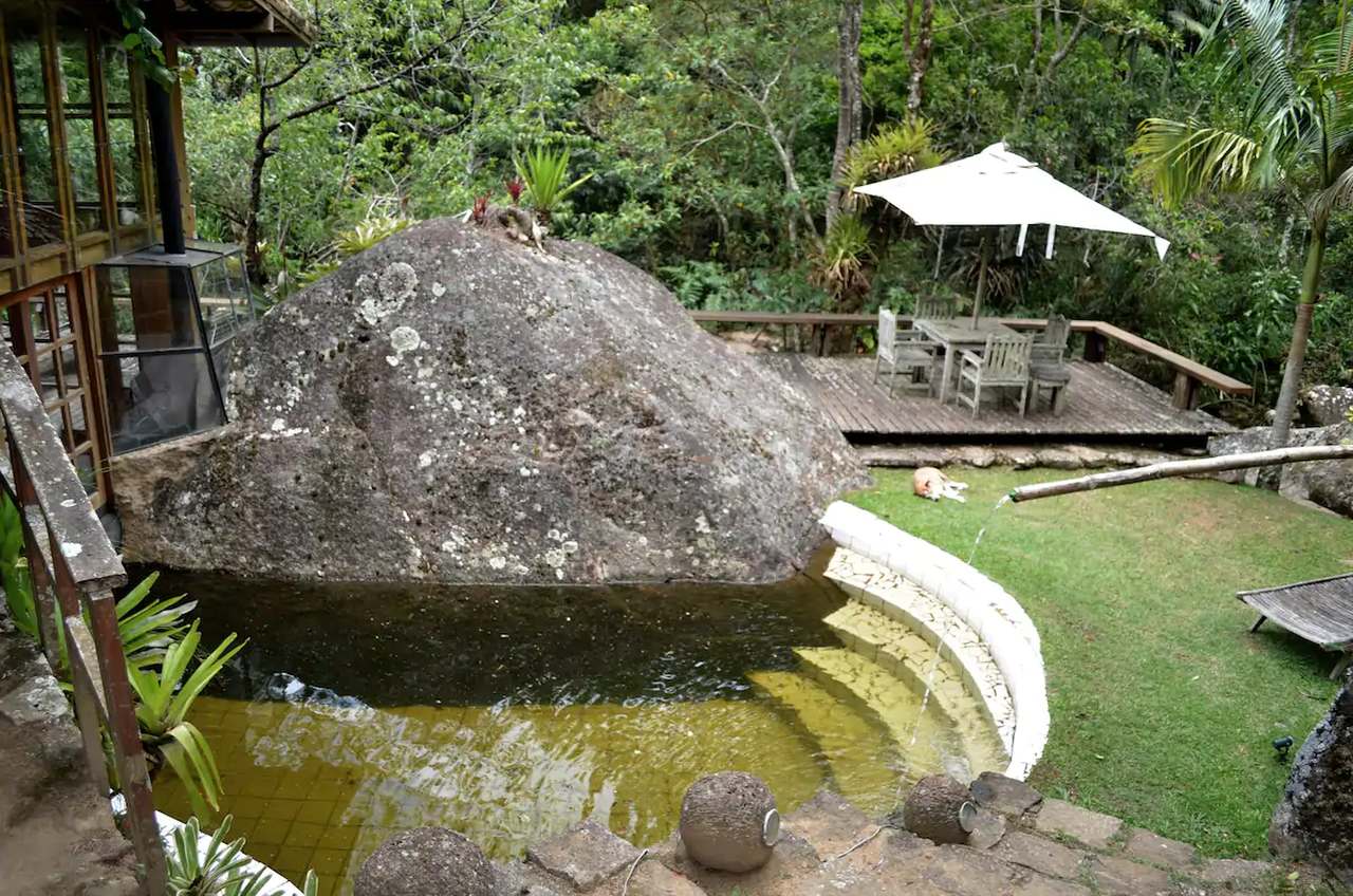 Uma piscina de água natural, paredes envidraçadas dão abertuda para a Mata Atlântica e uma bela interação com uma bela pedra. Tudo isso e muito mais na Casa Design no Vale das Videiras, é uma ótima opção para até 4 hóspedes amantes da natureza. Os cômodos estão bem integrados, com uma lareira e ainda é possível admirar a Cachoeira da Ponte Funda.