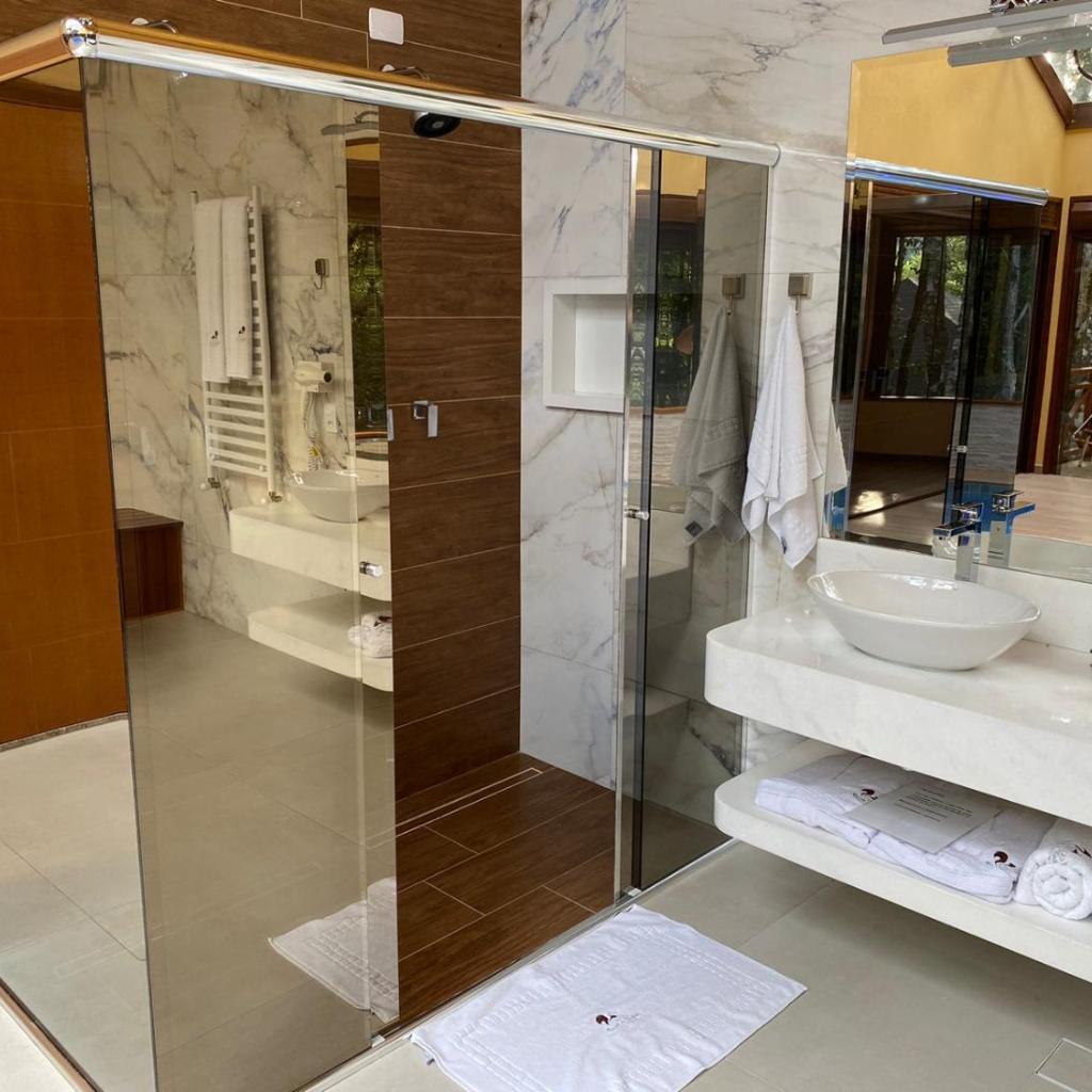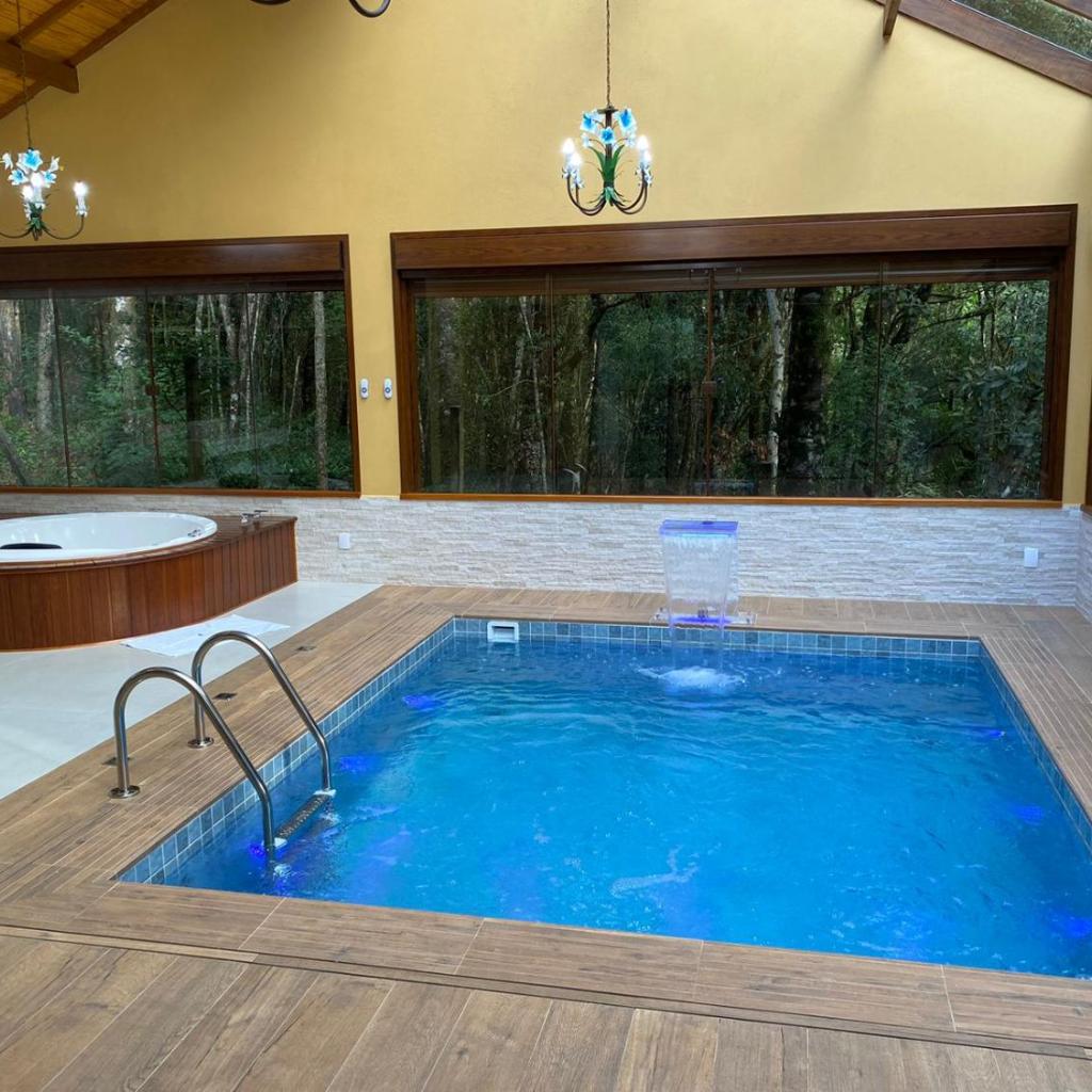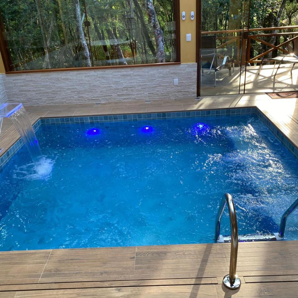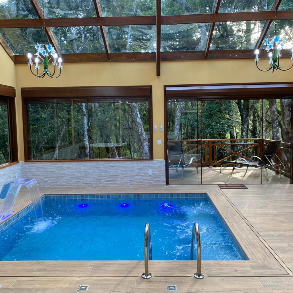 As persianas blackout são automáticas, facilitando o descanso. A piscina privativa tem sistema de iluminação por cores, reforçando a atmosfera relax. O café da manhã chega no chalé, com pães caseiros e produtos orgânicos. A varanda permite observar esquilos e pássaros.
