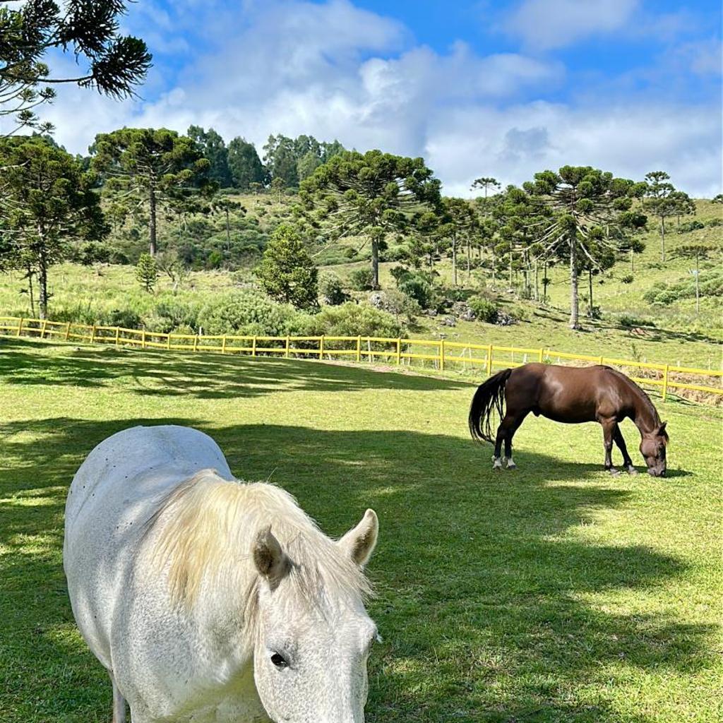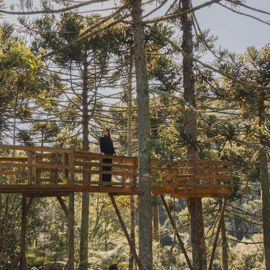 Recepção envolve até cavalos para te guiar ao chalé. Trilhas partem direto da propriedade, com conexão à floresta de araucárias. Café da manhã chega no chalé, preparado com cuidado e estilo.