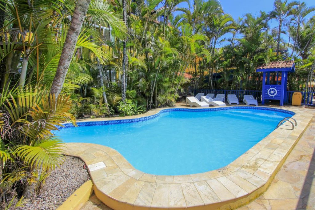 Pousada Ilha Vitória | Praia de Maranduba | R$ 480 | Piscina ao ar livre e restaurante rodeado por verde |